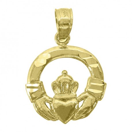 14kt Yellow Gold Unisex Diamond-cut Circle Heart Crown Hands Claddagh Good Luck Pendant Charm