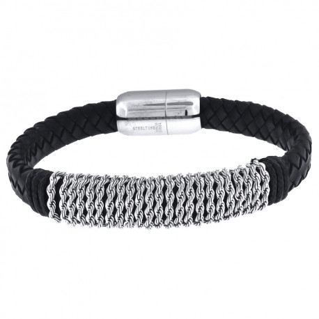 Stainless Steel Mens Black Leather With Magnetic Clasps Bracelet