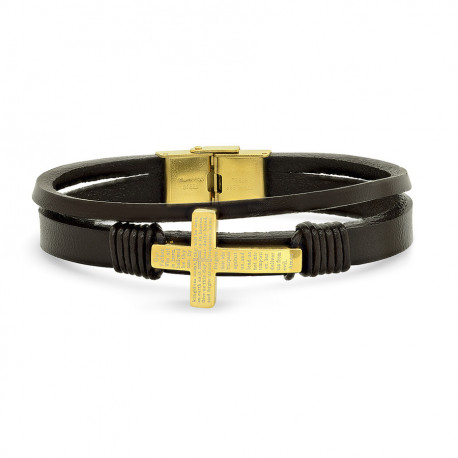 Stainless Steel Yellow-tone Mens Cross Religious Black Leather Bracelet