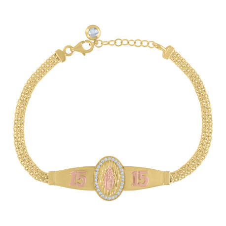 10kt Two-tone Gold Womens Cubic-Zirconia Quinceanera 15 Guadalupe Charm Bracelet Size 8 Inches